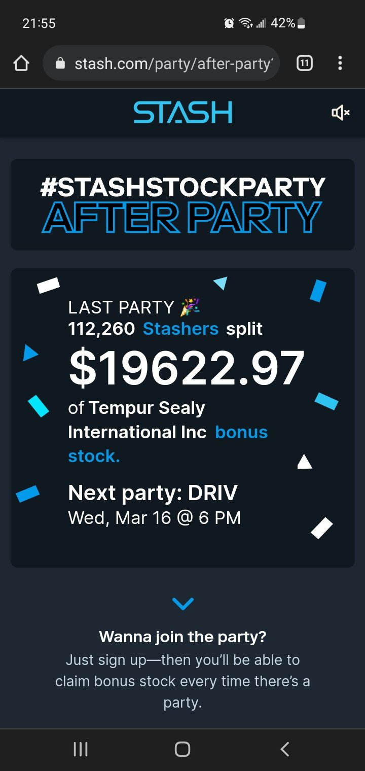 Stock parties has changed again. Each weekday Stash uses Twitter to announce which stock will be given away that day and then the party begins at 4pm EST. Ready to Get Started Today.